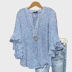 Povišajte svoj klasični slog s to elegantno majico v modri odtenek z vertikalnimi belimi črtami. Njen minimalističen dizajn združuje eleganco in praktičnost, medtem ko rokavi z volančki dodajajo ženstvenost in gibčnost. Idealna je za vsakodnevne videze ter bolj formalne priložnosti.