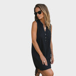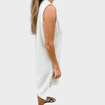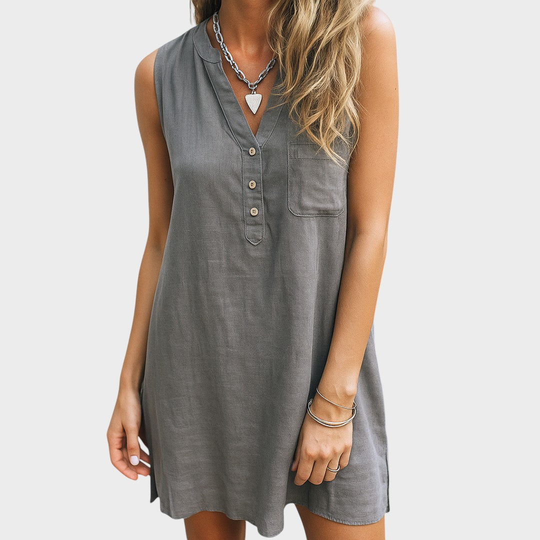 Odkrijte našo lahko in zračno obleko, idealno za tople dni. S brezrokavnim dizajnom, modernim V-izrezom in dekorativnimi gumbi, ponuja udobje in preprosto eleganco. Praktična sprednja žepa dodajata funkcionalnost in slog.