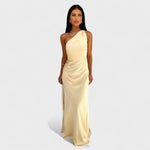 Obleka Aurélia je pravi luksuz v gibanju. Z asimetričnim dekoltejem, satenskim materialom in ovitimi nabranimi detajli, je popolna izbira za sijaj ob posebnih priložnostih brez kompromisov v udobnosti.