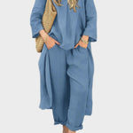 Odkrijte naš stilni laneni komplet v temno modri barvi, ki združuje preprosto eleganco in vsakodnevno praktičnost. Idealno za poletne izlete, nudi svobodo gibanja in lahkotno eleganco.