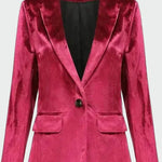 Impresiven sako z baršunasto teksturo, ki prinaša luksuz in eleganco v vsak videz. Njegov klasičen ovratnik v kombinaciji z enim gumbom na sprednjem delu ustvarja popolno ravnotežje med brezčasnim in modernim slogom.