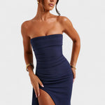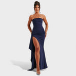 Gala maksi obleka z dramatičnim razporkom je vaša nova izbira za eleganco in stil. Ta brez-naramnična obleka je zasnovana za poudarjanje vaše postave ter podaljšanje silhuete.