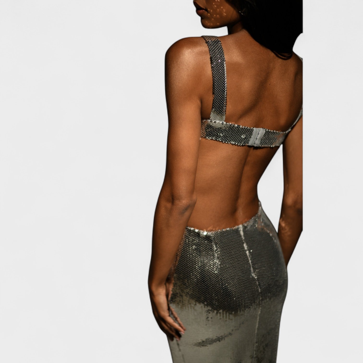Obleka Kiara pritegne pozornost že ob prvem pogledu. Njena svetleča tkanina s bleščicami elegantno odraža svetlobo, medtem ko stranski razporki oblikujejo senzualno silhueto. Zasnovana je za ženske, ki si upajo sijati v vsakem koraku.