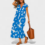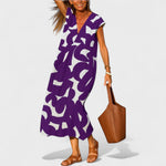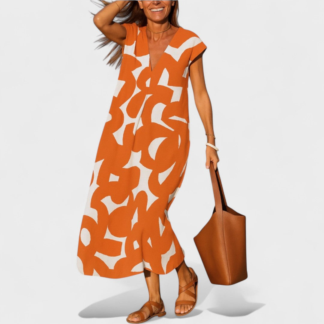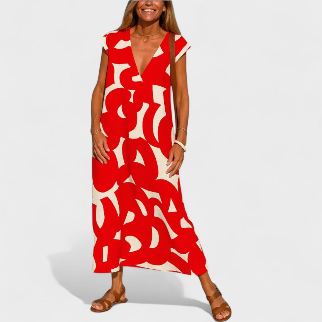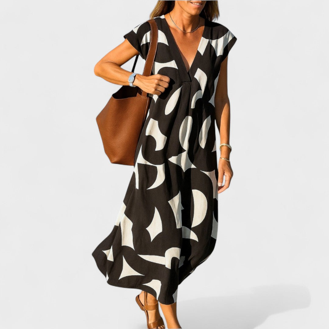 Odkrijte popolno ravnotežje med umetniško eleganco in sproščeno udobje s to dolgo obleko, okrašeno z edinstvenim abstraktnim vzorcem. Idealna za vroče poletne dni, ponuja zračno prileganje in poseben stil v vsaki kombinaciji.