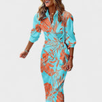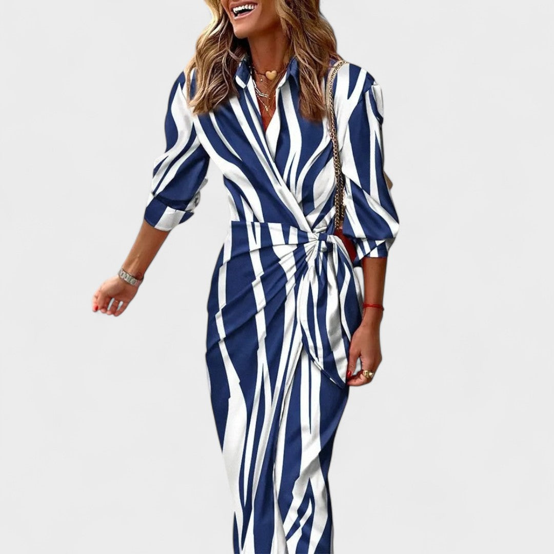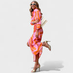 Živahna dolga obleka, ki očara v gibanju! Obleka s srajčnim krojem, elegantnim ovratnikom in gumbi, iz lahke in prožne tkanine, ki lepo pada. Njena fluidna silhueta s prefinjenim razporkom ustvarja takojšen učinek.