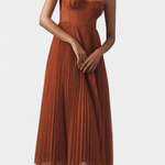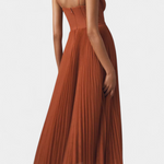 Obleka Nives združuje mehkobo plisirane šifonske tkanine in trdnost klasičnega korzeta, kar ustvarja čarobno ravnotežje med eleganco in definicijo. Njen srcoliki izrez nežno okvirja bust, medtem ko midi krilo v obliki zvona sledi vsakemu koraku s fluidnostjo.