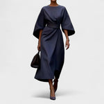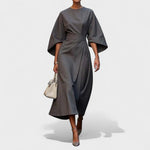Odkrijte našo rafinirano dolgo obleko z ladijskim izrezom in voluminoznimi rokavi, ki gradi prefinjeno, arhitekturno silhueto. Širok pas poudarja vašo postavo, medtem ko razkošna krila omogočajo svobodo gibanja in graciozen korak.