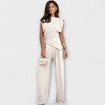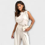 Skulpturalna eleganca z modernim pridihom: Sofia set združuje asimetrični top z širokimi hlačami, kar ustvarja elegantno silhueto, ki se gladko giblje. Idealno za posebne priložnosti ali za brezskrbno dvigovanje vsakodnevnega videza.