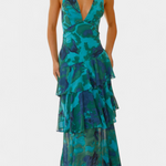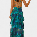 Odkrijte obleko Valentina - lahkotno, romantično in elegantno, zasnovano za gibanje z vami. Ta obleka združuje globok V-izrez z lepršavimi plastmi chifona, ki nežno ovijajo vašo silhueto, medtem ko njeni toni, navdihnjeni z dragimi kamni, dodajajo pridih sproščene sofisticiranosti.