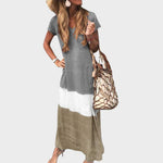 Odkrijte svojo novo najljubšo poletno obleko! Ta zračna in udobna maxi obleka je zasnovana za tople dni in sproščene trenutke. S ležernim krojem nudi maksimalno udobje, medtem ko kombinacija barv ustvarja moderen in boho videz.