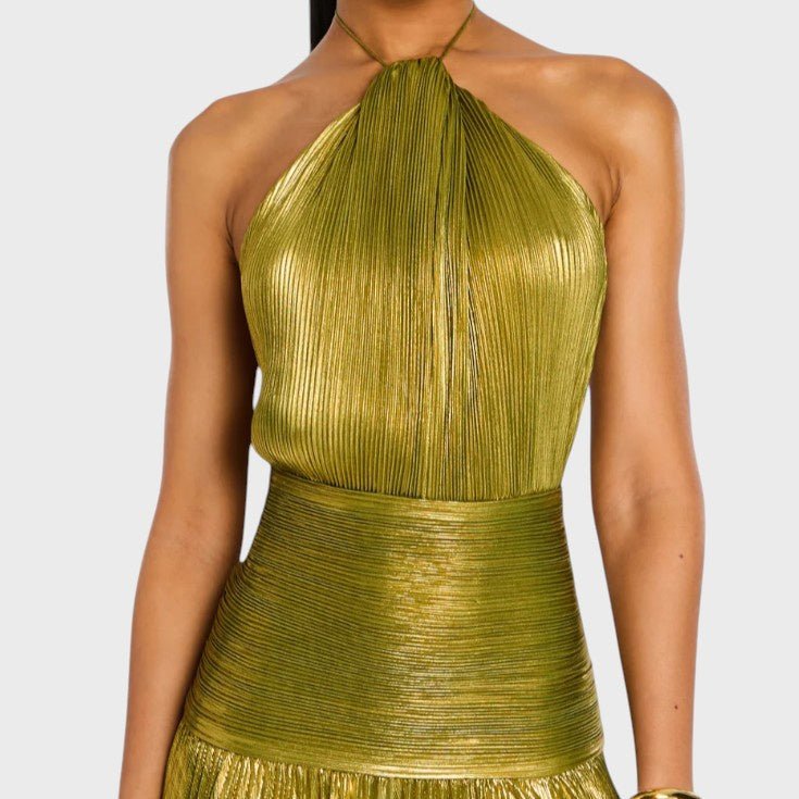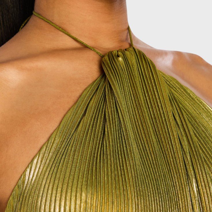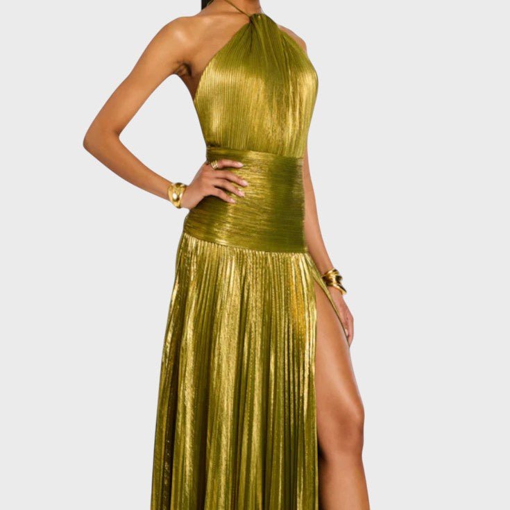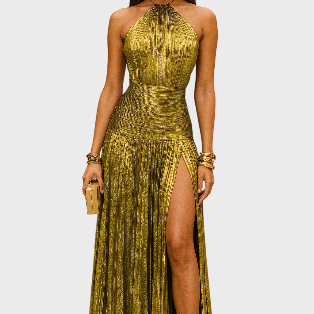 Obleka Vilma očara s svojim metalik peridot odtenkom, lahkotno silhueto in rafiniranimi detajli. S halter izrezom, odprtimi hrbti in visokim razporkom združuje drznost in eleganco – idealna za gala večerje, večerje in nepozabne noči, polne mistike in ženstvenosti.