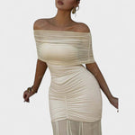 Odkrijte našo dolgo obleko iz pletenine, ki je prava oda elegantni senzualnosti. Z odkritimi rameni in ozkim krojem se popolnoma prilega vašemu telesu, medtem ko prosojna krila dodajajo fluidnost in sofisticiranost vsakemu gibu. Idealna izbira za posebne dogodke, ki vas bo izpostavila s modernim in drznih videzom.